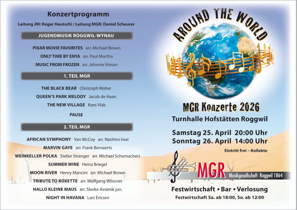 Das Konzert steht unter dem Motto: MGR ‘Around the World’. Ein spannendes Eintauchen in bekannte und auch fremde Melodien. Eine musikalische Reise rund um den Globus, auf der unser neuer Dirigent Daniel Scheurer als Reiseführer zusammen mit Instrumentenklang verschiedene Teile der Welt musikalisch bereist. Geniessen Sie auch die kulinarische Umrahmung!
